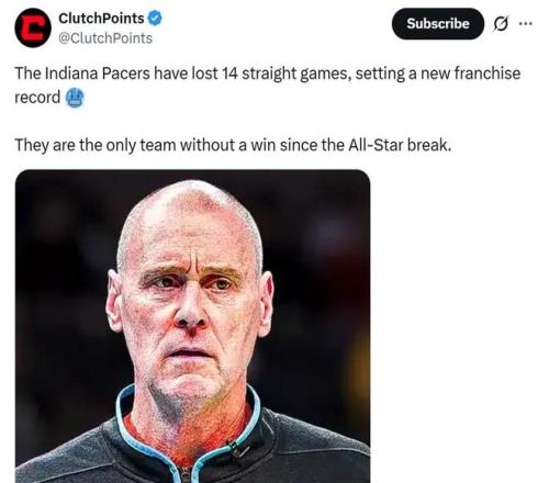 步行者队的处境也是如此,从上个赛季总决赛抢七遗憾不敌雷霆的总冠军,迅速沦为本赛季无底线摆烂的鱼腩球队,如今还遭遇14连败打破队史最差纪录。