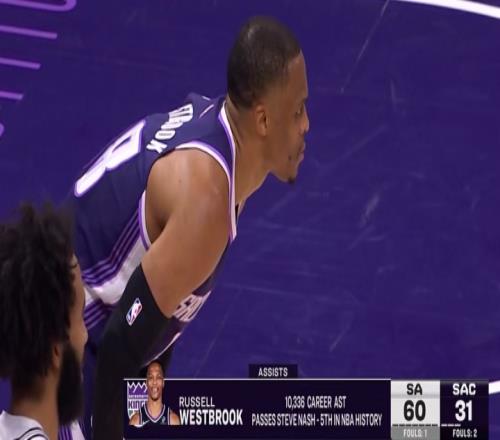 威少上半场送出3个助攻,生涯总助攻数来到10336个,超越马克·杰克逊和纳什,独占历史第5,排在第4的是詹姆斯。