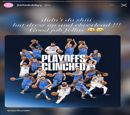 赛后,本场继续因伤缺阵的雷霆球员杰伦·威廉姆斯更新Instagram Story,转发雷霆提前锁定季后赛的庆祝海报,并写道:“除了精心打扮并在场边加油外,我啥也没干!伙计们,干得漂亮!