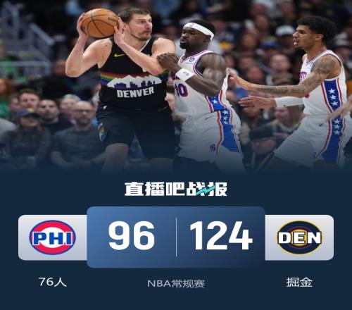 比赛开始,约基奇各种助攻带队打出16-7开局,76人全民皆兵止血回应,但掘金进攻十分流畅还是领先到双位数,首节掘金领先16分,次节76人进攻端受阻半节仅得5分,掘金顺势拉开20分以上领先,随后卡梅隆·约翰逊连得11分助掘金半场领先32分。下半场,双方展开对攻战,但分差还是保持在30分左右,76人连续3记三分追分,但掘金通过罚球还能保持29分领先,末节双方都换上替补练兵,双方围绕着30分左右分差继续拉锯战,最终掘金124-96大胜76人。