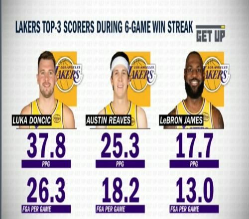里夫斯6连胜期间场均出手18.2次,场均砍25.3分