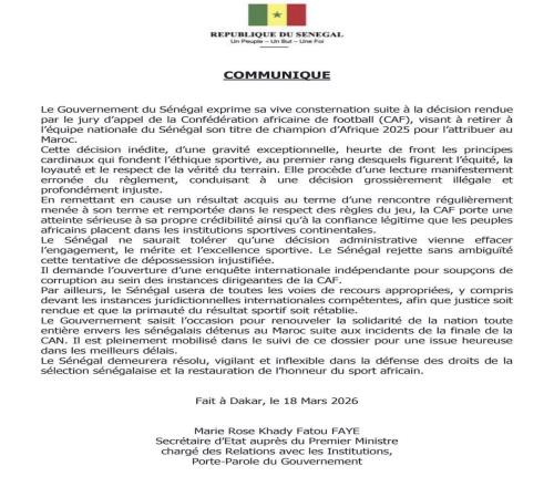 政府借此重申:举国上下声援因非洲杯决赛事件在摩洛哥被拘押的塞内加尔公民。政府正全力跟进此案,力争尽快妥善解决。