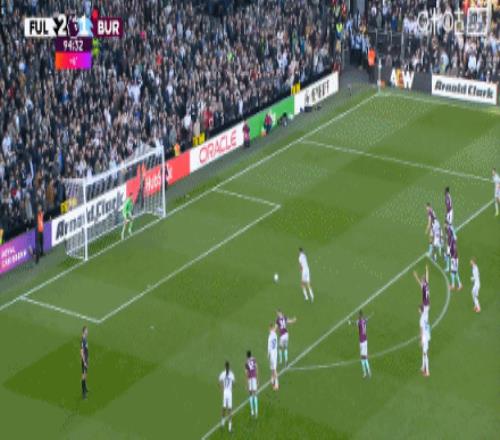 第90+5分钟,劳伦特禁区犯规染红,希门尼斯点射命中,富勒姆3-1伯恩利