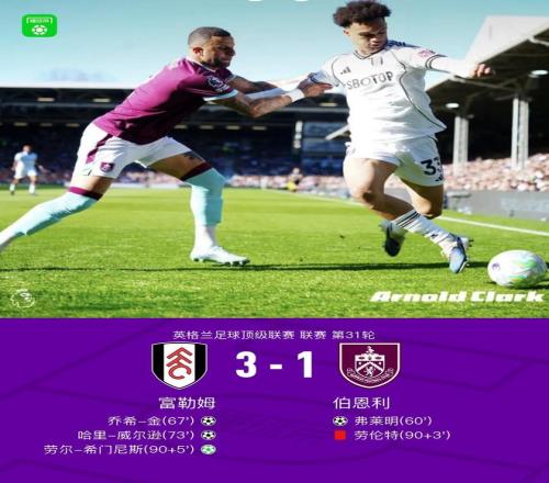 北京时间3月21日英格兰足球超级联赛第31轮,富勒姆主场对阵伯恩利。下半场弗莱明首开记录,乔希-金破门扳平比分,哈里-威尔逊破门反超,劳尔-希门尼斯造点亲自主罚命中,劳伦特被红牌罚下。伯恩利弗莱明破门。最终比分富勒姆 3-1 伯恩利。